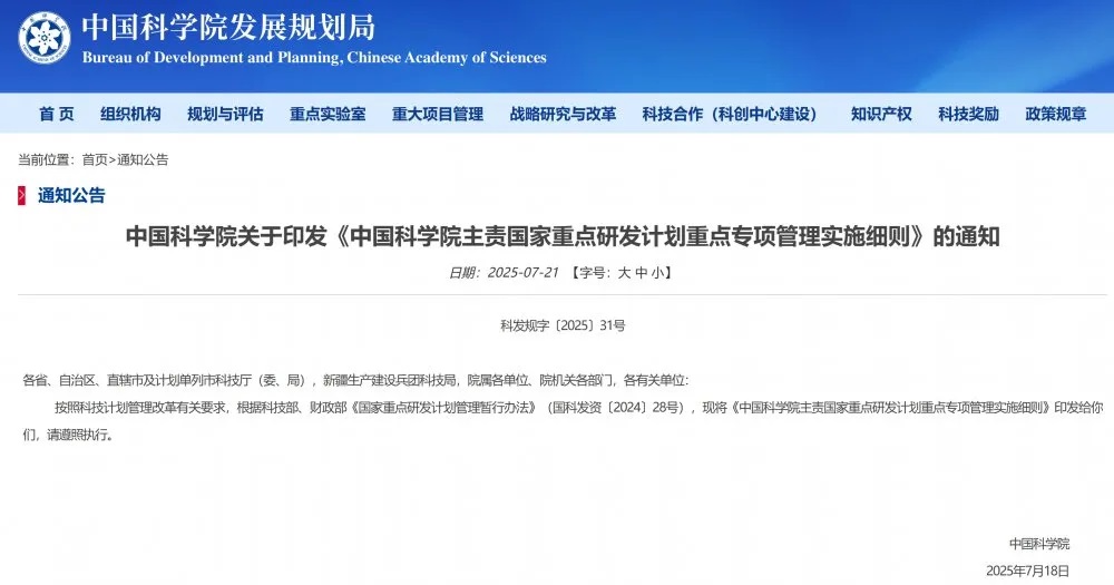 中國科學(xué)院正式印發(fā)《中國科學(xué)院主責(zé)國家重點(diǎn)研發(fā)計(jì)劃重點(diǎn)專項(xiàng)管理實(shí)施細(xì)則》(以下簡稱《細(xì)則》)。